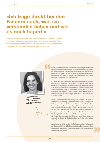 %u00abIch frage direkt bei den Kindern nach, was sie verstanden haben und wo es noch hapert.%u00bbDas Schulblatt hat nachgefragt, wie p%u00e4dagogisch T%u00e4tige im Thurgau ihre Arbeit reflektieren und ihren Unterricht weiterentwickeln. Auch die P%u00e4dagogische Hochschule Thurgau erkl%u00e4rt, wie sie angehende Lehrpersonen auf diese wichtige Aufgabe vorbereitet.FOKUS11Schulblatt Thurgau 1 | M%u00e4rz 2025Reflexion bedeutet f%u00fcr mich innehalten und die eigenen Ans%u00e4tze hinterfragen. Nur so kann man sich stetig verbessern und auf die Bed%u00fcrfnisse der Klasse eingehen. In der Praxis hat man aber nicht die Zeit, jede Lektion zu reflektieren. Der Denkprozess erfolgt aber trotzdem. Je l%u00e4nger man unterrichtet, wird dieser Prozess verinnerlicht und automatisiert.Ich reflektiere besonders dann, wenn das innere Gef%u00fchl mir sagt, dass es nicht rund l%u00e4uft. Dann denke ich dar%u00fcber nach, warum etwas gut oder nicht gut lief, was ich ver%u00e4ndern kann und wie die Sch%u00fclerinnen und Sch%u00fcler reagiert haben. So frage ich direkt bei den Kindern nach, was sie verstanden haben und wo es noch hapert. Ich ermutige die Kinder auch, bei ihren Mitsch%u00fclerinnen und Mitsch%u00fclern R%u00fcckmeldungen einzuholen %u2013 das f%u00f6rdert ihre Selbst%u00e4ndigkeit.Bei der Unterrichtsreflexion %u00fcberlege ich, was die Sch%u00fclerinnen und Sch%u00fcler weiterbringt. So arbeite ich mit einem Lerntagebuch. Es basiert auf dem Leitbild unserer Schule mit den Pfeilern St%u00e4rkenorientierung, Beziehungspflege, Verantwortungsbewusstsein und Weiterentwicklung. Diese Schwerpunkte versuche ich bei den Kindern sichtbar zu machen und im Unterricht zu integrieren. Anhand von Fragen %u2013 wie z.B. %u00abWie hast du den Konflikt gel%u00f6st?%u00bb beim Schwerpunkt Beziehungspflege %u2013 denken die Kinder %u00fcber sich oder den Unterricht nach. Wenn ich weiss, was sich die Kinder f%u00fcr Gedanken %u00fcber den Unterricht und %u00fcber sich selbst machen, lerne ich sie besser kennen.Abschliessend richte ich bei der Reflexion meinen Fokus auch auf die Unterrichts- und Selbstorganisation. Denn wenn ein Kind nicht weiss, was es tun muss, f%u00e4ngt es an, sich zu langweilen und allenfalls zu st%u00f6ren.Annick Pouly, Klassenlehrperson 5.+6. Klasse,VSG, Diessenhofen