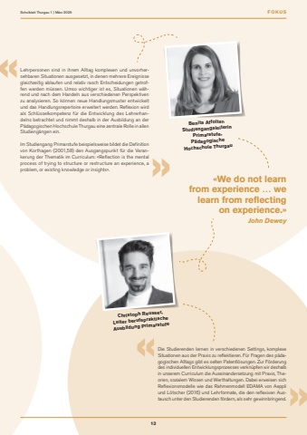 FOKUS13Schulblatt Thurgau 1 | M%u00e4rz 2025Christoph Reusser, Leiter berufspraktische Ausbildung Primarstufe %u00abWe do not learn from experience %u2026 we learn from reflecting on experience.%u00bb John DeweyDie Studierenden lernen in verschiedenen Settings, komplexe Situationen aus der Praxis zu reflektieren. F%u00fcr Fragen des p%u00e4dagogischen Alltags gibt es selten Patentl%u00f6sungen. Zur F%u00f6rderung des individuellen Entwicklungsprozesses verkn%u00fcpfen wir deshalb in unserem Curriculum die Auseinandersetzung mit Praxis, Theorien, sozialem Wissen und Werthaltungen. Dabei erweisen sich Reflexionsmodelle wie das Rahmenmodell EDAMA von Aeppli und L%u00f6tscher (2016) und Lehrformate, die den reflexiven Austausch unter den Studierenden f%u00f6rdern, als sehr gewinnbringend.Lehrpersonen sind in ihrem Alltag komplexen und unvorhersehbaren Situationen ausgesetzt, in denen mehrere Ereignisse gleichzeitig ablaufen und relativ rasch Entscheidungen getroffen werden m%u00fcssen. Umso wichtiger ist es, Situationen w%u00e4hrend und nach dem Handeln aus verschiedenen Perspektiven zu analysieren. So k%u00f6nnen neue Handlungsmuster entwickelt und das Handlungsrepertoire erweitert werden. Reflexion wird als Schl%u00fcsselkompetenz f%u00fcr die Entwicklung des Lehrerhandelns betrachtet und nimmt deshalb in der Ausbildung an der P%u00e4dagogischen Hochschule Thurgau eine zentrale Rolle in allen Studieng%u00e4ngen ein. Im Studiengang Primarstufe beispielsweise bildet die Definition von Korthagen (2001,58) den Ausgangspunkt f%u00fcr die Verankerung der Thematik im Curriculum: %u00abReflection is the mental process of trying to structure or restructure an experience, a problem, or existing knowledge or insights%u00bb.Benita Affolter, Studiengangsleiterin Primarstufe, P%u00e4dagogische Hochschule Thurgau