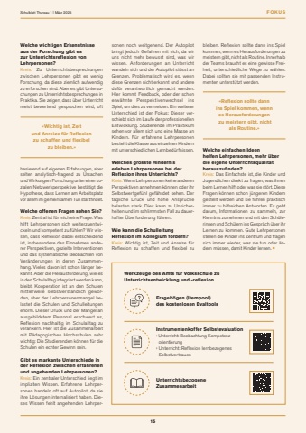 FOKUS15Schulblatt Thurgau 1 | M%u00e4rz 2025sonen noch weitgehend. Der Autopilot bringt jedoch Gefahren mit sich, da wir uns nicht mehr bewusst sind, was wir wissen. Anforderungen an Unterricht wandeln sich und der Autopilot st%u00f6sst an Grenzen. Problematisch wird es, wenn diese Grenzen nicht erkannt und andere daf%u00fcr verantwortlich gemacht werden. Hier kommt Feedback, oder der schon erw%u00e4hnte Perspektivenwechsel ins Spiel, um dies zu vermeiden. Ein weiterer Unterschied ist der Fokus: Dieser verschiebt sich im Laufe der professionellen Entwicklung. Studierende im Praktikum sehen vor allem sich und eine Masse an Kindern. F%u00fcr erfahrene Lehrpersonen besteht die Klasse aus einzelnen Kindern mit unterschiedlichen Lernbed%u00fcrfnissen.Welches gr%u00f6sste Hindernis erleben Lehrpersonen bei der Reflexion ihres Unterrichts?Kreis: Wenn Lehrpersonen keine anderen Perspektiven annehmen k%u00f6nnen oder ihr Selbstwertgef%u00fchl gef%u00e4hrdet sehen. Der t%u00e4gliche Druck und hohe Anspr%u00fcche belasten stark. Dies kann zu Unsicherheiten und im schlimmsten Fall zu dauerhafter %u00dcberforderung f%u00fchren.Wie kann die Schulleitung Reflexion im Kollegium f%u00f6rdern?Kreis: Wichtig ist, Zeit und Anreize f%u00fcr Reflexion zu schaffen und flexibel zu Welche wichtigen Erkenntnisse aus der Forschung gibt es zur Unterrichtsreflexion von Lehrpersonen?Kreis: Zu Unterrichtsbesprechungen zwischen Lehrpersonen gibt es wenig Forschung, da diese ziemlich aufwendig zu erforschen sind. Aber es gibt Untersuchungen zu Unterrichtsbesprechungen in Praktika. Sie zeigen, dass %u00fcber Unterricht meist bewertend gesprochen wird, oft basierend auf eigenen Erfahrungen, aber selten analytisch-fragend zu Ursachen und Wirkungen. Forschung unter einer sozialen Netzwerkperspektive best%u00e4tigt die Hypothese, dass Lernen am Arbeitsplatz vor allem im gemeinsamen Tun stattfindet.Welche offenen Fragen sehen Sie?Kreis: Zentral ist f%u00fcr mich eine Frage: Was hilft Lehrpersonen sich weiterzuentwickeln und kompetent zu f%u00fchlen? Wir wissen, dass Reflexion dabei entscheidend ist, insbesondere das Einnehmen anderer Perspektiven, gezielte Interventionen und das systematische Beobachten von Ver%u00e4nderungen in deren Zusammenhang. Vieles davon ist schon l%u00e4nger bekannt. Aber die Herausforderung, wie es in den Schulalltag integriert werden kann, bleibt. Kooperation ist an den Schulen mittlerweile selbstverst%u00e4ndlich geworden, aber der Lehrpersonenmangel belastet die Schulen und Schulleitungen enorm. Dieser Druck und der Mangel an ausgebildetem Personal erschwert es, Reflexion nachhaltig im Schulalltag zu verankern. Hier ist die Zusammenarbeit mit P%u00e4dagogischen Hochschulen sehr wichtig: Die Studierenden k%u00f6nnen f%u00fcr die Schulen ein echter Gewinn sein.Gibt es markante Unterschiede in der Reflexion zwischen erfahrenen und angehenden Lehrpersonen?Kreis: Ein zentraler Unterschied liegt im impliziten Wissen. Erfahrene Lehrpersonen handeln oft auf Autopilot, da sie ihre L%u00f6sungen internalisiert haben. Dieses Wissen fehlt angehenden Lehrper-%u00abWichtig ist, Zeit und Anreize f%u00fcr Reflexion zu schaffen und flexibel zu bleiben.%u00bbbleiben. Reflexion sollte dann ins Spiel kommen, wenn es Herausforderungen zu meistern gibt, nicht als Routine. Innerhalb der Teams braucht es eine gewisse Freiheit, unterschiedliche Wege zu w%u00e4hlen. Dabei sollten sie mit passenden Instrumenten unterst%u00fctzt werden.Welche einfachen Ideen helfen Lehrpersonen, mehr %u00fcber die eigene Unterrichtsqualit%u00e4t herauszufinden?Kreis: Das Einfachste ist, die Kinder und Jugendlichen direkt zu fragen, was ihnen beim Lernen hilft oder was sie st%u00f6rt. Diese Fragen k%u00f6nnen schon j%u00fcngeren Kindern gestellt werden und sie f%u00fchren praktisch immer zu hilfreichen Antworten. Es geht darum, Informationen zu sammeln, zur Kenntnis zu nehmen und mit den Sch%u00fclerinnen und Sch%u00fclern ins Gespr%u00e4ch %u00fcber ihr Lernen zu kommen. Gute Lehrpersonen stellen die Kinder ins Zentrum und fragen sich immer wieder, was sie tun oder %u00e4ndern m%u00fcssen, damit Kinder lernen. %u00a1%u00abReflexion sollte dann ins Spiel kommen, wenn es Herausforderungen zu meistern gibt, nicht als Routine.%u00bbInstrumentenkoffer Selbstevaluation%u203a Unterricht: Beobachtung Kompetenz- orientierung%u203a Unterricht: Reflexion lernbezogenes SelbstvertrauenFrageb%u00f6gen (Itempool) des kostenlosen EvaltoolsUnterrichtsbezogene ZusammenarbeitWerkzeuge des Amts f%u00fcr Volksschule zu Unterrichtsentwicklung und -reflexion