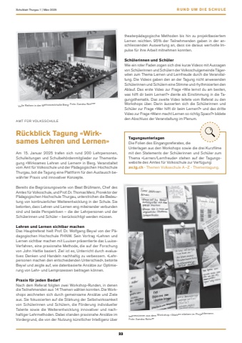 23Schulblatt Thurgau 1 | M%u00e4rz 2025 RUND UM DIE SCHULEtheaterp%u00e4dagogische Methoden bis hin zu projektbasiertem Lernen reichten. 95% der Teilnehmenden gaben in der anschliessenden Auswertung an, dass sie daraus wertvolle Impulse f%u00fcr ihre Arbeit mitnehmen konnten.Sch%u00fclerinnen und Sch%u00fclerWie ein roter Faden zogen sich drei kurze Videos mit Aussagen von Sch%u00fclerinnen und Sch%u00fclern der Volksschulgemeinde T%u00e4gerwilen zum Thema Lernen und Lernfreude durch die Veranstaltung. Die Videos gaben den an der Tagung nicht anwesenden Sch%u00fclerinnen und Sch%u00fclern eine Stimme und rhythmisierten den Ablauf. Das erste Video zur Frage %u00abWie lernst du am besten, was hilft dir beim Lernen?%u00bb diente als Einstimmung in die Tagungsthematik. Das zweite Video leitete vom Referat zu den Workshops %u00fcber. Darin %u00e4usserten sich die Sch%u00fclerinnen und Sch%u00fcler zur Frage %u00abWer hilft dir beim Lernen?%u00bb und das dritte Video zur Frage %u00abWann macht Lernen so richtig Spass?%u00bb bildete den Abschluss der Veranstaltung im Plenum. AMT F%u00dcR VOLKSSCHULER%u00fcckblick Tagung %u00abWirksames Lehren und Lernen%u00bbAm 15. Januar 2025 trafen sich rund 200 Lehrpersonen, Schulleitungen und Schulbeh%u00f6rdenmitglieder zur Thementagung %u00abWirksames Lehren und Lernen%u00bb in Berg. Veranstaltet vom Amt f%u00fcr Volksschule und der P%u00e4dagogischen Hochschule Thurgau, bot die Tagung eine Plattform f%u00fcr den Austausch bew%u00e4hrter Praxis und innovativer Konzepte.Bereits die Begr%u00fcssungsworte von Beat Br%u00fcllmann, Chef des Amtes f%u00fcr Volksschule, und Prof. Dr. Thomas Merz, Prorektor der P%u00e4dagogischen Hochschule Thurgau, unterstrichen die Bedeutung von kontinuierlicher Weiterentwicklung in der Schule. Sie betonten, dass Lehren und Lernen eng miteinander verbunden sind und beide Perspektiven %u2013 die der Lehrpersonen und der Sch%u00fclerinnen und Sch%u00fcler %u2013 ber%u00fccksichtigt werden m%u00fcssen.Lehren und Lernen sichtbar machenDas Hauptreferat hielt Prof. Dr. Wolfgang Beywl von der P%u00e4dagogischen Hochschule FHNW. Sein Vortrag %u00abLehren und Lernen sichtbar machen mit Luuise%u00bb pr%u00e4sentierte das LuuiseVerfahren, eine praxisnahe Methode, die auf der Forschung von John Hattie basiert. Ziel ist es, Unterricht durch evaluatives Denken und Handeln nachhaltig zu verbessern. %u00abLehrpersonen machen den entscheidenden Unterschied%u00bb, betonte Beywl und zeigte auf, wie datenbasierte Ans%u00e4tze zur Optimierung von Lehr- und Lernprozessen beitragen k%u00f6nnen.Praxis f%u00fcr jeden BedarfNach dem Referat folgten zwei Workshop-Runden, in denen die Teilnehmenden aus 14 Themen w%u00e4hlen konnten. Die Workshops zeichneten sich durch gemeinsame Ans%u00e4tze und Ziele aus. Sie fokussierten auf die St%u00e4rkung der Selbstwirksamkeit von Sch%u00fclerinnen und Sch%u00fclern, die F%u00f6rderung individueller Talente sowie die Weiterentwicklung innovativer und nachhaltiger Lehrmethoden. Dabei standen praxisnahe Ans%u00e4tze im Vordergrund, die von der Nutzung k%u00fcnstlicher Intelligenz %u00fcber TagungsunterlagenDie Folien des Eingangsreferates, die Unterlagen aus den Workshops sowie die drei Kurzfilme mit den Statements der Sch%u00fclerinnen und Sch%u00fcler zum Thema %u00abLernen/Lernfreude%u00bb stehen auf der Tagungswebsite des Amtes f%u00fcr Volksschule zur Verf%u00fcgung:av.tg.ch %u203a Themen Volksschule A%u2013Z %u203a Thementagung.Volle Reihen in der Mehrzweckhalle Berg. Foto: Sandra Rohner Impressionen aus dem Workshop %u00abSt%u00e4rken st%u00e4rken im Projektlernen%u00bb.Foto: Sandra Rohner