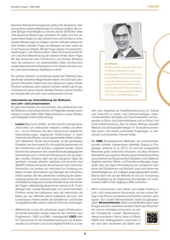 FOKUS9Schulblatt Thurgau 1 | M%u00e4rz 2025sehr viele Angebote zur Qualit%u00e4tsentwicklung von Schule und Unterricht zu finden sind: Evaluationsb%u00f6gen, Unterrichtsmaterialien, Konzepte und Praxismaterialien zur Kooperation in Schul- und Unterrichtsteams und zur Schul- und Unterrichtsentwicklung. Das f%u00fcr diesen Beitrag relevante Material sind die Evaluationsb%u00f6gen im %u00abEvaluationscenter%u00bb. Hier lassen sich bereits entwickelte Frageb%u00f6gen zu zahlreichen hochrelevanten Themen finden. %u2022 Bei EMU (Evidenzbasierte Methoden der Unterrichtsdiagnostik) erhalten Lehrpersonen ebenfalls Zugang zu Frageb%u00f6gen (Helmke et al., 2011). Es wird auf ausgew%u00e4hlte Merkmale guten Unterrichts fokussiert, wie etwa effiziente Klassenf%u00fchrung, kognitive Aktivierung, lernf%u00f6rderliches Klima sowie Klarheit und Strukturiertheit. Zus%u00e4tzlich wird in EMU ein Abgleich zwischen Selbst- und Fremdeinsch%u00e4tzungen angestrebt. Also die eigene Einsch%u00e4tzung der Lehrperson kann denen der Sch%u00fclerinnen und Sch%u00fclern sowie auch denen der Arbeitskolleginnen und -kollegen gegen%u00fcbergestellt werden. Ebenso l%u00e4sst sich auf der Website ein Tool zur Auswertung und Visualisierung der Ergebnisse herunterladen. Im Unterschied zu IQES ist der Zugang zu EMU kostenfrei. %u2022 Wenn Lehrpersonen sich st%u00e4rker auf soziale Aspekte in Lehr- und Lernprozessen fokussieren und das soziale Gef%u00fcge in der Klasse systematisch betrachten m%u00f6chten, dann eignen sich soziale Netzwerkkarten (siehe Eingangsbeispiel). Netzwerkkarten bilden soziale Beziehungen einer Gruppe auf einer zweidimensionalen Fl%u00e4che ab. Diese Karten sind ein m%u00e4chtiges Instrument, um sich der Komplexit%u00e4t sozialer Beziehungssysteme anzun%u00e4hern. Hierzu habe ich (Galle, 2024) eine Webapplikation entwickelt, in der nach dem Hochladen der Daten eine besseres Klassenklima beginnen sollte (z.B. Gespr%u00e4che %u00fcber ein positives soziales Miteinander). Es ist kaum m%u00f6glich, das soziale Gef%u00fcge vollumf%u00e4nglich zu kennen, da bei 20 Kindern etwa 190 dyadische Beziehungen bestehen. Es bietet sich hier an, systematisch Daten von den Sch%u00fclerinnen und Sch%u00fclern zu ihren sozialen Beziehungen zu erheben. Hierbei stellt die Lehrperson allen Kindern dieselbe Frage, zum Beispiel, mit wem spielst du in der Pause am liebsten. Mit der Frage werden Freundschaftsbeziehungen in der Klasse erfasst. Jedes Kind beantwortet f%u00fcr sich und ohne Beeinflussung der anderen Kinder diese Frage. Mit den Antworten aller Sch%u00fclerinnen und Sch%u00fcler (Evidenz) kann die Lehrperson nun weiterarbeiten, indem sie etwa eine soziale Netzwerkkarte (Soziogramm) ihrer Klasse mit einer weiter unten beschriebenen Applikation erstellt.Ein solches Arbeiten mit Evidenzen bietet das Potenzial, dass alle Kinder dieselben M%u00f6glichkeiten haben, ihre Sicht der Lehrperson mitzuteilen. Zudem kann die Lehrperson eigene %u00abblinde Flecken%u00bb aufdecken, also Aspekte sichtbar machen, die ihr gar nicht bewusst waren. Solche %u00abblinden Flecken%u00bb sind im Kontext der Komplexit%u00e4t von Lehr- und Lernprozessen normal.Instrumente zur Unterst%u00fctzung der Reflexionvon Lehr- und LernprozessenEs gibt eine Vielzahl von Instrumenten, die Lehrpersonen bei der Reflexion unterst%u00fctzen k%u00f6nnen. Im Folgenden werden sechs skizziert: Luuise, IQES, EMU, Netzwerkkarten, Lesson Studies und kollegiales Unterrichtscoaching.%u2022 Luuise (Beywl et al., 2023) %u2013 ein Akronym f%u00fcr %u00abLehrpersonen unterrichten und untersuchen integriert, sichtbar und effektiv%u00bb %u2013 ist ein Verfahren, bei dem Lehrpersonen spezifische Herausforderungen, sogenannte %u00abKnackn%u00fcsse%u00bb, in ihrem Unterricht identifizieren und auf gesammelten Daten aufbauend reflektieren. Positiv hervorzuheben ist der partizipative Charakter des Instruments: Es soll m%u00f6glichst gemeinsam mit den Sch%u00fclerinnen und Sch%u00fclern umgesetzt werden. Zuerst benennt die Lehrperson eine wiederkehrende p%u00e4dagogische Herausforderung im Unterricht (%u00abKnacknuss%u00bb), die sie ver%u00e4ndern m%u00f6chte. Zweitens setzt sich die Lehrperson Ziele, die spezifisch, messbar, attraktiv, realistisch und terminiert sind (SMART). Drittens entwickelt die Lehrperson eine Unterrichtsintervention und viertens ein Instrument zur Erhebung von Daten, mit dem Informationen zum Gelingen der Intervention erfasst werden. Bei der praktischen Umsetzung der Datenerhebung achtet die Lehrperson darauf, diese in den Unterrichtsablauf zu integrieren und dass Sch%u00fclerinnen und Sch%u00fcler die Fragen selbstst%u00e4ndig beantworten k%u00f6nnen (z.B. Punktabfragen oder visuelle Darstellungen von Lernfortschritten). F%u00fcnftens wertet die Lehrperson nach der Intervention die Daten aus und reflektiert darauf aufbauend die Lehr- und Lernprozesse. Hierbei werden die Sch%u00fclerinnen und Sch%u00fcler und gegebenenfalls weitere relevante Personen einbezogen. %u2022 W%u00e4hrend bei Luuise die Lehrperson eigene Erhebungsinstrumente entwickelt, werden diese bei den n%u00e4chsten zwei Programmen %u2013 IQES und EMU %u2013 bereitgestellt. IQES steht f%u00fcr %u00abInstrumente f%u00fcr die Qualit%u00e4tsentwicklung und Selbstevaluation an Schulen%u00bb und ist eine digitale Plattform, auf der Zur PersonDr. Marco Galle ist Dozent und wissenschaftlicher Mitarbeiter an der P%u00e4dagogischen Hochschule Luzern. Er besch%u00e4ftigt sich mit Lernprozessen in sozialen Netzwerken und forscht zu den Themen Kooperation, Unterrichtsqualit%u00e4t und Professionalisierung. Seine Forschungsergebnisse fliessen in die Aus- und Weiterbildung ein.