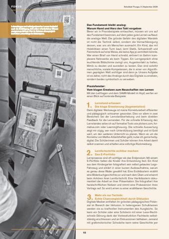 10FOKUS Schulblatt Thurgau 3 | September 2025Das Fundament bleibt analog: Warum Hand und Herz den Takt vorgebenBevor wir in Praxisbeispiele eintauchen, m%u00fcssen wir uns auf das Fundament besinnen, auf dem jedes gute Lernen aufbaut: die analoge Welt. Die gr%u00f6sste Gefahr des digitalen Wandels ist nicht die Technik selbst, sondern die Vernachl%u00e4ssigung dessen, was uns als Menschen ausmacht. Ein Kind, das mit Holzkl%u00f6tzen einen Turm baut, lernt Statik, Schwerkraft und Feinmotorik auf eine Weise, die keine App je vermitteln k%u00f6nnte. Wer einen Brief von Hand schreibt, aktiviert im Gehirn komplexere Netzwerke als beim Tippen. Ein Lerngespr%u00e4ch ohne leuchtende Bildschirme zwingt uns, Augenkontakt zu halten, Mimik zu deuten und ausreden zu lassen. Das sind zutiefst menschliche, soziale Kompetenzen, die in einer von Algorithmen gepr%u00e4gten Welt wichtiger sind denn je. Unsere Aufgabe ist es daher, nicht das Analoge durch das Digitale zu ersetzen, sondern beides symbiotisch zu verweben.Praxisfenster: Vom klugen Ersetzen zum Neuschaffen von LernenMit den Leitfragen und dem SAMR-Modell im Kopf, werfen wir einen Blick auf konkrete Beispiele:Lernstand erfassen: Die kluge Erweiterung (Augmentation)Dank digitaler Werkzeuge ist meine Korrekturarbeit effizienter und p%u00e4dagogisch wirksamer geworden. Dies vor allem in zwei Bereichen: bei der Lernstandserhebung und beim direkten Feedback f%u00fcr die Lernenden. F%u00fcr die schnelle Erfassung des Lernstandes setze ich auf formative Tools wie plickers.com, formative.com oder LearningView.org. Die schnelle Auswertung zeigt mir z%u00fcgig, wer noch Unterst%u00fctzung ben%u00f6tigt und ist Gold wert, um den weiteren Unterricht zu planen. Wenn es um die Korrektur von Mathe-Arbeitsheften geht, nutze ich gerne herby.digital. Die Sch%u00fclerinnen und Sch%u00fcler k%u00f6nnen ihre Arbeit damit selbst scannen und erhalten eine sofortige R%u00fcckmeldung.Lernfortschritte sichtbar machen: Das E-PortfolioLernprozesse sind oft wichtiger als das Endprodukt. Mit einem E-Portfolio halten die Kinder ihre Entwicklung fest. Ein Kind aus dem Kindergarten fotografiert sein selbst gebautes LegoFahrzeug und erkl%u00e4rt in einer kurzen Audioaufnahme, warum es genau diese R%u00e4der gew%u00e4hlt hat. Eine Erstkl%u00e4sslerin erz%u00e4hlt eine Bilderbuchgeschichte vor und nach dem %u00dcben und erkennt beim Anh%u00f6ren ihren Lernfortschritt. Eine Viertkl%u00e4sslerin dokumentiert die Arbeit an ihrer Pr%u00e4sentation: Sie fotografiert ihre handschriftlichen Notizen und nimmt eine Probeversion ihres Vortrags auf. So wird Lernen zu einer erz%u00e4hlbaren Geschichte.Mehr als nur Technik: Echte Chancengleichheit durch DiklusionDigitale Medien entfalten ihr gr%u00f6sstes p%u00e4dagogisches Potenzial im Bereich der Inklusion. In heterogenen Schulklassen werden sie zu kraftvollen Instrumenten des Ausgleichs. So kann ein Sch%u00fcler oder eine Sch%u00fclerin mit einer Lese-Rechtschreib-St%u00f6rung dank der Vorlesefunktion Fachtexte selbstst%u00e4ndig erschliessen und an Diskussionen teilhaben. Jemand mit grafomotorischer Schw%u00e4che kann seine Geschichte per Lebenslanges und selbstgesteuertes Lernen bedeutet auch die Bef%u00e4higung, sich selber erforderliches Wissen aneignen zu k%u00f6nnen. Hier im Rahmen eines projektbasierten Lernsettings im Makerspace.1.2.3.