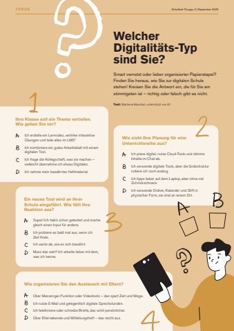 FOKUS Schulblatt Thurgau 3 | September 2025Wie sieht Ihre Planung f%u00fcr eine Unterrichtsreihe aus?Ich plane digital, nutze Cloud-Tools und stimme Inhalte im Chat ab.Ich verwende digitale Tools, aber die Grobstruktur notiere ich noch analog.Ich tippe lieber auf dem Laptop, aber ohne viel Schnickschnack.Ich verwende Ordner, Kalender und Stift in physischer Form, sie sind an einem Ort.Welcher Digitalit%u00e4ts-Typ sind Sie?Smart vernetzt oder lieber organisierter Papierstapel? Finden Sie heraus, wie Sie zur digitalen Schule stehen! Kreisen Sie die Antwort ein, die f%u00fcr Sie am stimmigsten ist %u2013 richtig oder falsch gibt es nicht. Text: Marilena Maiullari, unterst%u00fctzt von KIIhre Klasse soll ein Thema vertiefen. Wie gehen Sie vor?Wie organisieren Sie den Austausch mit Eltern?Ich erstelle ein Lernvideo, verlinke interaktive %u00dcbungen und teile alles im LMS* Ich kombiniere ein gutes Arbeitsblatt mit einem digitalen Tool.Ich frage die Kollegschaft, was sie machen %u2013 vielleicht %u00fcbernehme ich etwas Digitales.Ich nehme mein bew%u00e4hrtes Heftmaterial.%u00dcber Messenger-Funktion oder Videotools %u2013 das spart Zeit und Wege.Ich nutze E-Mail und gelegentlich digitale Sprechstunden.Ich telefoniere oder schreibe Briefe, das wirkt pers%u00f6nlicher.%u00dcber Elternabende und Mitteilungsheft %u2013 das reicht aus.Ein neues Tool wird an Ihrer Schule eingef%u00fchrt. Wie f%u00e4llt Ihre Reaktion aus?Super! Ich hab%u2019s schon getestet und mache gleich einen Input f%u00fcr andere.Ich probiere es bald mal aus, wenn ich Zeit finde.Ich warte ab, wie es sich bew%u00e4hrt.Muss das sein? Ich arbeite lieber mit dem, was ich kenne.