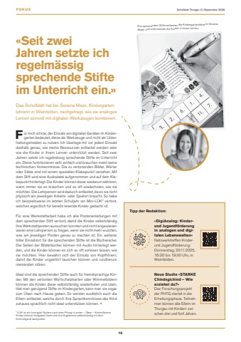 FOKUS16Schulblatt Thurgau 3 | September 2025Tipp der Redaktion:Neue Studie %u00abSTARKE Chindsgichind %u2013 Wie erziehst du?%u00bbDas Forschungsprojekt der PHTG startet in die Erhebungsphase. Teilnehmen k%u00f6nnen alle Eltern im Thurgau mit Kindern zwischen drei und f%u00fcnf Jahren. %u00abDigiAnalog: Kinderund Jugendf%u00f6rderung in analogen und digitalen Lebenswelten%u00bbNetzwerktreffen Kinderund Jugendf%u00f6rderung: Donnerstag, 20.11.2025, 16:30 bis 19:30 Uhr, in Weinfelden.%u00fcr mich ist klar, der Einsatz von digitalen Ger%u00e4ten im Kindergarten bedeutet, diese als Werkzeuge und nicht als Unterhaltungsmedien zu nutzen. Ich %u00fcberlege mir vor jedem Einsatz deshalb genau, wie meine Ressourcen entlastet werden oder wie die Kinder in ihrem Lernen unterst%u00fctzt werden. Seit zwei Jahren setzte ich regelm%u00e4ssig sprechende Stifte im Unterricht ein. Diese funktionieren sehr einfach und brauchen meist keine technischen Vorkenntnisse. Die zu vertonenden Bilder, W%u00f6rter oder S%u00e4tze sind mit einem speziellen Klebepunkt versehen. Mit dem Stift wird eine Audiodatei aufgenommen und auf dem Klebepunkt hinterlegt. Die Kinder k%u00f6nnen diese wiederum abh%u00f6ren, wann immer sie es brauchen und so oft wiederholen, wie sie m%u00f6chten. Die Lehrperson wird dadurch entlastet, da es sie nicht physisch am jeweiligen Arbeits- oder Spielort braucht. So habe ich beispielsweise im letzten Schuljahr ein Mini-L%u00dcK* vertont, welches eigentlich f%u00fcr bereits lesende Kinder gedacht ist. F%u00fcr eine Werkstattarbeit habe ich alle Postenanleitungen mit dem sprechenden Stift vertont, damit die Kinder selbstst%u00e4ndig ihre Werkstattposten aussuchen konnten und nicht angewiesen waren eine Lehrperson zu fragen, wenn sie nicht mehr wussten, was am jeweiligen Posten genau zu machen ist. Ein weiterer toller Einsatzort f%u00fcr die sprechenden Stifte ist die B%u00fccherecke. Die Seiten der Bilderb%u00fccher k%u00f6nnen mit Audio hinterlegt werden, und die Kinder k%u00f6nnen es sich so oft vorlesen lassen, wie sie m%u00f6chten. Hier bew%u00e4hrt sich der Einsatz von Kopfh%u00f6rern, damit die Kinder ungest%u00f6rt lauschen k%u00f6nnen und rundherum niemanden st%u00f6ren.Ideal sind die sprechenden Stifte auch f%u00fcr fremdsprachige Kinder. Mit den vertonten Wortschatzkarten oder Wimmelbildern k%u00f6nnen die Kinder diese selbstst%u00e4ndig wiederholen und %u00fcben. Hat man gen%u00fcgend Stifte im Kindergarten, kann man sie sogar zum %u00dcben nach Hause geben. So werden zus%u00e4tzlich auch die Eltern entlastet, welche durch ihre Sprachkenntnisse das Kind zuhause sprachlich nicht ideal unterst%u00fctzen k%u00f6nnen. %u00a1*L%u00dcK ist ein Lernspiel-System nach dem Prinzip %u00abLernen %u2013 %u00dcben %u2013 Kontrollieren%u00bb. Kinder k%u00f6nnen Aufgaben l%u00f6sen und ihre Ergebnisse selbstst%u00e4ndig mit dem Kontrollger%u00e4t %u00fcberpr%u00fcfen.%u00abSeit zwei Jahren setzte ich regelm%u00e4ssig sprechende Stifte im Unterricht ein.%u00bbDas Schulblatt hat bei Seraina Maier, Kindergartenlehrerin in Weinfelden, nachgefragt, wie sie analogesLernen sinnvoll mit digitalen Werkzeugen kombiniert.Die sprechenden Stifte entlasten die Kindergartenlehrerin Seraina Maier und unterst%u00fctzen die Kinder in ihrem Lernen. F