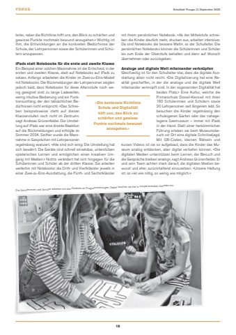 FOKUS18Schulblatt Thurgau 3 | September 2025mit ihrem pers%u00f6nlichen Notebook. %u00abAb der Mittelstufe schreiben die Kinder deutlich mehr, drucken aus, arbeiten intensiver. Da sind Notebooks die bessere Wahl%u00bb, so der Schulleiter. Die pers%u00f6nlichen Notebooks k%u00f6nnen die Sch%u00fclerinnen und Sch%u00fcler bis zum Ende der Oberstufe behalten und dann auf Wunsch %u00fcbernehmen oder zur%u00fcckgeben.Analoge und digitale Welt miteinander verkn%u00fcpfenGleichzeitig ist f%u00fcr den Schulleiter klar, dass die digitale Ausstattung allein nicht reicht. %u00abDie Digitalisierung hat eine Realit%u00e4t geschaffen, in der die analoge und die digitale Welt miteinander verkn%u00fcpft sind. In der sogenannten Digitalit%u00e4t hat beides Platz.%u00bb Eine Kultur, welche die Primarschule Dozwil-Kesswil mit ihren 160 Sch%u00fclerinnen und Sch%u00fclern sowie 20 Lehrpersonen seit l%u00e4ngerem lebt. So besuchen die Kinder regelm%u00e4ssig den schuleigenen Garten oder das nahegelegene Seemuseum %u2013 immer mit iPads in der Hand. Statt einer herk%u00f6mmlichen F%u00fchrung erleben sei beim Museumsbesuch vor Ort eine digitale Schnitzeljagd. Mit QR-Codes, kleinen R%u00e4tseln und kurzen Videos ist sie so aufgebaut, dass die Kinder das Museum analog entdecken, aber digital vertiefen k%u00f6nnen. %u00abDie digitalen Medien unterst%u00fctzen beim Lernen, der Besuch und die Gespr%u00e4che bleiben analog%u00bb, sagt Andreas Gr%u00fcnenfelder. Er und sein Team achten stark darauf, die digitalen Medien bewusst und eher zur%u00fcckhaltend einzusetzen. %u00abUnsere Haltung ist: so viel wie n%u00f6tig, so wenig wie m%u00f6glich.%u00bbleiter, %u00ababer die Richtlinie hilft uns, den Blick zu sch%u00e4rfen und gewisse Punkte nochmals bewusst anzugehen.%u00bb Wichtig ist ihm, die Entwicklungen an die konkreten Bed%u00fcrfnisse der Schule, der Lehrpersonen sowie der Sch%u00fclerinnen und Sch%u00fclern anzupassen.iPads statt Notebooks f%u00fcr die erste und zweite KlasseEin Beispiel einer solchen Massnahme ist der Entscheid, in der ersten und zweiten Klasse, statt auf Notebooks auf iPads zu setzen. Anfangs arbeiteten die Kinder im Zwei-zu-Eins-Modell mit Notebooks. Die R%u00fcckmeldungen der Lehrpersonen zeigten jedoch bald, dass Notebooks f%u00fcr diese Altersstufe noch wenig geeignet sind: zu lange Ladezeiten, wenig intuitive Bedienung und ein Funktionsumfang, der den tats%u00e4chlichen Bed%u00fcrfnissen nicht entspricht. %u00abDas Schreiben beispielsweise steht auf diesen Klassenstufen noch nicht im Zentrum%u00bb, sagt Andreas Gr%u00fcnenfelder. Die Umstellung auf iPads war eine direkte Reaktion auf die R%u00fcckmeldungen und erfolgte im Sommer 2024. Seither wurde die Massnahme in Gespr%u00e4chen mit Lehrpersonen regelm%u00e4ssig evaluiert. %u00abAlle sind sich einig: Die Umstellung hat sich bew%u00e4hrt. Die Ger%u00e4te sind schnell einsetzbar, unterst%u00fctzen spielerisches Lernen und erm%u00f6glichen einen kreativen Umgang mit Medien.%u00bb Nichts ver%u00e4ndert hat sich hingegen f%u00fcr die Sch%u00fclerinnen und Sch%u00fcler ab der dritten Klasse. Sie arbeiten weiterhin mit Notebooks: die Dritt- und Viertkl%u00e4ssler jeweils in einer Zwei-zu-Eins-Ausstattung, die F%u00fcnft- und Sechstkl%u00e4ssler Die Sch%u00fclerinnen und Sch%u00fcler arbeiten mit den Ozobots an Programmierungen. Dabei tauchen sie tief in kooperierendes Arbeiten ein.%u00abDie kantonale Richtlinie Schule und Digitalit%u00e4thilft uns, den Blick zu sch%u00e4rfen und gewisse Punkte nochmals bewusst anzugehen.%u00bb