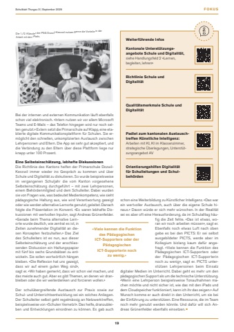 FOKUS19Schulblatt Thurgau 3 | September 2025schon eine Weiterbildung zu K%u00fcnstlicher Intelligenz. %u00abDas war ein wertvoller Austausch, auch %u00fcber die eigene Schule hinaus.%u00bb Davon w%u00fcrde er sich mehr w%u00fcnschen. In der Realit%u00e4t sei es aber oft eine Herausforderung, da im Schulalltag h%u00e4ufig die Zeit fehle. %u00abDas ist etwas, woran wir noch arbeiten m%u00fcssen%u00bb, sagt er. Ebenfalls noch etwas Luft nach oben gebe es bei den PICTS: Er sei selbst ausgebildeter PICTS, werde aber im Kollegium bislang kaum daf%u00fcr angefragt. %u00abViele kennen die Funktion des P%u00e4dagogischen ICT-Supporters oder der P%u00e4dagogischen ICT-Supporterin noch zu wenig%u00bb, sagt er. PICTS unterst%u00fctzen Lehrpersonen beim Einsatz digitaler Medien im Unterricht. Dabei geht es mehr um den p%u00e4dagogischen Support als um die technische Unterst%u00fctzung. %u00abWenn eine Lehrperson beispielsweise Tonaufnahmen machen m%u00f6chte und nicht sicher ist, wie das mit den iPads und dem Cloudspeicher funktioniert, kann ich ihr das zeigen.%u00bb Auf Wunsch komme er auch direkt in den Unterricht, um sie bei der Einf%u00fchrung zu unterst%u00fctzen. Eine Ressource, die im Team noch mehr genutzt werden k%u00f6nnte. Und daf%u00fcr will sich Andreas Gr%u00fcnenfelder ebenfalls einsetzen. %u00a1Bei der internen und externen Kommunikation l%u00e4uft ebenfalls schon viel elektronisch. %u00abIntern nutzen wir vor allem Microsoft Teams und E-Mails %u2013 das Telefon hingegen wird nur noch selten genutzt.%u00bb Extern setzt die Primarschule auf Klapp, eine etablierte digitale Kommunikationsplattform f%u00fcr Schulen. Sie erm%u00f6glicht den schnellen, unkomplizierten Austausch zwischen Lehrpersonen und Eltern. Die App sei sehr gut akzeptiert, und die Verbindung zu den Eltern %u00fcber diese Plattform liege nur knapp unter 100 Prozent.Eine Selbsteinsch%u00e4tzung, lebhafte DiskussionenDie Richtlinie des Kantons helfen der Primarschule DozwilKesswil immer wieder ins Gespr%u00e4ch zu kommen und %u00fcber Schule und Digitalit%u00e4t zu diskutieren. So wurde beispielsweise im vergangenen Schuljahr die vom Kanton vorgesehene Selbsteinsch%u00e4tzung durchgef%u00fchrt %u2013 mit zwei Lehrpersonen, einem Beh%u00f6rdenmitglied und dem Schulleiter. Dabei wurden sie von Fragen wie, was bedeutet Medienkompetenz, wie sieht p%u00e4dagogische Haltung aus, wie wird Verantwortung gezeigt oder wie werden alternative Lernorte genutzt, geleitet. Danach folgte die Pr%u00e4sentation im Konvent. %u00abEs waren lebhafte Diskussionen mit wertvollen Inputs%u00bb, sagt Andreas Gr%u00fcnenfelder. %u00abGerade beim Thema alternative Lernorte wurde deutlich, wie zentral es ist, in Zeiten zunehmender Digitalit%u00e4t an diesen Konzepten festzuhalten.%u00bb Das Ziel des Schulleiters ist es nun, aus dieser Selbsteinsch%u00e4tzung und der anschliessenden Diskussion ein Haltungspapier mit f%u00fcnf bis sechs Grunds%u00e4tzen zu entwickeln. Sie sollen wortw%u00f6rtlich h%u00e4ngen bleiben. %u00abDie Reflexion hat uns gezeigt, dass wir auf einem guten Weg sind%u00bb, sagt er. %u00abWir haben gemerkt, dass wir schon viel machen, und das meiste auch gut. Aber es gibt Themen, an denen wir dranbleiben oder die wir weiterdenken und forcieren wollen.%u00bb Der schul%u00fcbergreifende Austausch zur Praxis sowie zur Schul- und Unterrichtsentwicklung sei ein solches Anliegen. Der Schulleiter selbst geht regelm%u00e4ssig an Netzwerktreffen, beispielsweise von %u00abSchulen Vernetzt%u00bb. Das helfe, dranzubleiben und Entwicklungen einordnen zu k%u00f6nnen. Es gab auch %u00abViele kennen die Funktion des P%u00e4dagogischen ICT-Supporters oder der P%u00e4dagogischen ICT-Supporterin noch zu wenig.%u00bbDie 1./2. Kl%u00e4ssler der PSG Dozwil-Kesswil nutzen gerne die Vorteile in der Arbeit mit den iPads.Weiterf%u00fchrende InfosKantonale Unterst%u00fctzungsangebote Schule und Digitalit%u00e4t, siehe Handlungsfeld 2 %u00abLernen, begleiten, lehren%u00bbRichtlinie Schule und Digitalit%u00e4t Qualit%u00e4tsmerkmale Schule und Digitalit%u00e4tPadlet zum kantonalen Austauschtreffen K%u00fcnstliche Intelligenz: Arbeiten mit KI, KI im Klassenzimmer, strategische %u00dcberlegungen, Unterst%u00fctzungsangebot AVOrientierungshilfen Digitalit%u00e4t f%u00fcr Schulleitungen und Schulbeh%u00f6rden