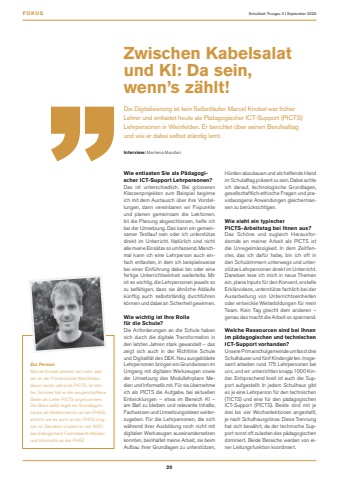 FOKUS20Schulblatt Thurgau 3 | September 2025Wie entlasten Sie als P%u00e4dagogischer ICT-Support Lehrpersonen?Das ist unterschiedlich. Bei gr%u00f6sseren Klassenprojekten zum Beispiel beginne ich mit dem Austausch %u00fcber ihre Vorstellungen, dann vereinbaren wir Fixpunkte und planen gemeinsam die Lektionen. Ist die Planung abgeschlossen, helfe ich bei der Umsetzung. Das kann ein gemeinsamer Testlauf sein oder ich unterst%u00fctze direkt im Unterricht. Nat%u00fcrlich sind nicht alle meine Eins%u00e4tze so umfassend. Manchmal kann ich eine Lehrperson auch einfach entlasten, in dem ich beispielsweise bei einer Einf%u00fchrung dabei bin oder eine fertige Unterrichtseinheit weiterleite. Mir ist es wichtig, die Lehrpersonen jeweils so zu bef%u00e4higen, dass sie %u00e4hnliche Abl%u00e4ufe k%u00fcnftig auch selbstst%u00e4ndig durchf%u00fchren k%u00f6nnen und dabei an Sicherheit gewinnen.Wie wichtig ist Ihre Rolle f%u00fcr die Schule?Die Anforderungen an die Schule haben sich durch die digitale Transformation in den letzten Jahren stark gewandelt %u2013 das zeigt sich auch in der Richtlinie Schule und Digitalit%u00e4t des DEK. Neu ausgebildete Lehrpersonen bringen ein Grundwissen im Umgang mit digitalen Werkzeugen sowie der Umsetzung des Modullehrplans Medien und Informatik mit. F%u00fcr sie %u00fcbernehme ich als PICTS die Aufgabe, bei aktuellen Entwicklungen %u2013 etwa im Bereich KI %u2013 am Ball zu bleiben und relevante Inhalte, Fachwissen und Umsetzungsideen weiterzugeben. F%u00fcr die Lehrpersonen, die sich w%u00e4hrend ihrer Ausbildung noch nicht mit digitalen Werkzeugen auseinandersetzen konnten, beinhaltet meine Arbeit, sie beim Aufbau ihrer Grundlagen zu unterst%u00fctzen, H%u00fcrden abzubauen und als helfende Hand im Schulalltag pr%u00e4sent zu sein. Dabei achte ich darauf, technologische Grundlagen, gesellschaftlich-ethische Fragen und praxisbezogene Anwendungen gleichermassen zu ber%u00fccksichtigen.Wie sieht ein typischer PICTS-Arbeitstag bei Ihnen aus?Das Sch%u00f6ne und zugleich Herausfordernde an meiner Arbeit als PICTS ist die Unregelm%u00e4ssigkeit. In dem Zeitfenster, das ich daf%u00fcr habe, bin ich oft in den Schulzimmern unterwegs und unterst%u00fctze Lehrpersonen direkt im Unterricht. Daneben lese ich mich in neue Themen ein, plane Inputs f%u00fcr den Konvent, erstelle Erkl%u00e4rvideos, unterst%u00fctze fachlich bei der Ausarbeitung von Unterrichtseinheiten oder entwickle Weiterbildungen f%u00fcr mein Team. Kein Tag gleicht dem anderen %u2013 genau das macht die Arbeit so spannend.Welche Ressourcen sind bei Ihnen im p%u00e4dagogischen und technischen ICT-Support vorhanden?Unsere Primarschulgemeinde umfasst drei Schulh%u00e4user und f%u00fcnf Kinderg%u00e4rten. Insgesamt arbeiten rund 175 Lehrpersonen bei uns, und wir unterrichten knapp 1000 Kinder. Entsprechend breit ist auch der Support aufgestellt: In jedem Schulhaus gibt es je eine Lehrperson f%u00fcr den technischen (TICTS) und eine f%u00fcr den p%u00e4dagogischen ICT-Support (PICTS). Beide sind mit je drei bis vier Wochenlektionen angestellt, je nach Schulhausgr%u00f6sse. Diese Trennung hat sich bew%u00e4hrt, da der technische Support sonst oft zulasten des p%u00e4dagogischen dominiert. Beide Bereiche werden von einer Leitungsfunktion koordiniert.Zwischen Kabelsalat und KI: Da sein, wenn%u2019s z%u00e4hlt!Die Digitalisierung ist kein Selbstl%u00e4ufer. Marcel Knobel war fr%u00fcher Lehrer und entlastet heute als P%u00e4dagogischer ICT-Support (PICTS)Lehrpersonen in Weinfelden. Er berichtet %u00fcber seinen Berufsalltag und wie er dabei selbst st%u00e4ndig lernt.Intervie Marilena MaiullariZur PersonMarcel Knobel arbeitet seit zehn Jahren an der Primarschule Weinfelden, davon sechs Jahre als PICTS. Im letzten Sommer hat er die neugeschaffene Stelle als Leiter PICTS angenommen. Die Basis daf%u00fcr legte ein Grundlagenmodul als Medienmentor an der PHSG, %u00e4hnlich wie es auch an der PHTG m%u00f6glich ist. Daneben studiert er seit 2021 berufsbegleitend Fachdidaktik Medien und Informatik an der PHSZ.