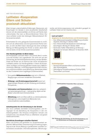 24RUND UM DIE SCHULE Schulblatt Thurgau 3 | September 2025AMT F%u00dcR VOLKSSCHULELeitfaden %u00abKooperation Eltern und Schule%u00bb praxisnah aktualisiertEltern bringen unterschiedliche Erfahrungen, Ressourcen und Erwartungen mit. Gerade in einer pluralisierten Gesellschaft k%u00f6nnen sich die Lebensrealit%u00e4ten von Schule und Familie stark unterscheiden. Das kann zu Missverst%u00e4ndnissen f%u00fchren. Der neue Leitfaden ersetzt den bisherigen Webseitenbereich %u00abElternzusammenarbeit%u00bb.Entscheidend f%u00fcr eine gelingende Zusammenarbeit ist, ob Eltern sich als willkommene und ernst genommene Partner erleben. Je mehr die Eltern davon %u00fcberzeugt sind, einen wichtigen Beitrag zum Bildungserfolg ihrer Kinder zu leisten, desto mehr sind sie bereit, mit der Schule zusammenzuarbeiten. Vier Handlungsfelder im Blick habenDie Kooperation zwischen Eltern und Schule dient in erster Linie den Kindern und Jugendlichen. Sie wirkt sich auf den Schulerfolg, die Pers%u00f6nlichkeitsentwicklung und das Wohlbefinden der Kinder aus. Im Zentrum des neuen aktualisierten Leitfadens stehen vier Handlungsfelder, in denen die Kooperation von Eltern und Schule gef%u00f6rdert werden kann: Willkommenskultur, Bildungs- und Erziehungspartnerschaft, Information und Kommunikation sowie Mitwirkung. Gemeinsam bilden sie das Fundament einer tragf%u00e4higen Zusammenarbeit. %u2022 Eine gelebte Willkommenskultur zeigt sich in Offenheit, Begegnungen und einem einladenden Schulumfeld. %u2022 Bildungs- und Erziehungspartnerschaft basiert auf gegenseitigem Respekt und dem Einbezug verschiedener Perspektiven. %u2022 Information und Kommunikation sollen klar, verl%u00e4sslich und adressatengerecht sein %u2013 mehrsprachig, digital und bei Bedarf unterst%u00fctzt durch Dolmetschende. %u2022 Mitwirkung reicht vom Elterncaf%u00e9 bis zu institutionalisierten Elterngremien und erm%u00f6glicht ein Miteinander trotz unterschiedlicher Lebensrealit%u00e4ten.Anhaltspunkte f%u00fcr die Umsetzung in der SchuleDer neue Leitfaden beinhaltet Umsetzungsideen und Anregungen f%u00fcr die Gestaltung der Kooperation in den vier Handlungsfeldern. Die Hinweise erm%u00f6glichen Schulen und Lehrpersonen, ihre aktuelle Praxis zu reflektieren und gezielt weiterzuentwickeln.Rechtliche Grundlagen schaffen KlarheitEltern und Schule sind gesetzlich zur Zusammenarbeit verpflichtet. W%u00e4hrend Eltern Verantwortung f%u00fcr Erziehung tragen, liegt es an der Schule, Bildung zu gew%u00e4hrleisten und Eltern unterst%u00fctzend einzubinden. Informationspflichten, MitwirkungsLust auf mehr? Angebote f%u00fcr Schulbeh%u00f6rden und Schulleitungen%u2022 Kurs %u00abElternzusammenarbeit mit Beachtung kultureller Aspekte%u00bb, Dienstag 21. Oktober 2025%u2022 Kurs %u00abHerausfordernde Situationen mit Erziehungsberechtigten%u00bb, Montag 27. Oktober 2025%u2022 Kantonales Treffen %u00abElternbildung mit Wirkung %u2013 Strategien f%u00fcr Schulen%u00bb, Mittwoch 12. November 2025Ank%u00fcndigungen%u2022 Fachinput Kooperation Eltern und Schule, buchbar %u00fcber Impulsangebote%u2022 Ank%u00fcndigung Schulleitungstagung Fr%u00fchling 2026: Thema Eltern und SchuleAngelehnt an die Qualit%u00e4tsmerkmale schulischer Elternarbeit: Die Handlungsfelder greifen ineinander und werden nicht isoliert bearbeitet oder betrachtet.rechte und Anh%u00f6rungsprozesse sind verbindlich geregelt. Im Leitfaden findet sich ein %u00dcberblick dazu.