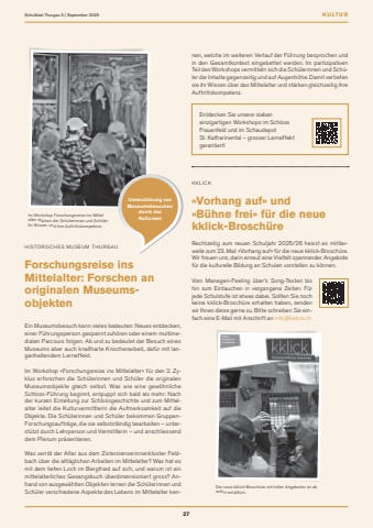 KKLICK%u00abVorhang auf%u00bb und %u00abB%u00fchne frei%u00bb f%u00fcr die neue kklick-Brosch%u00fcreRechtzeitig zum neuen Schuljahr 2025/26 heisst es mittlerweile zum 23. Mal: %u00abVorhang auf%u00bb f%u00fcr die neue kklick-Brosch%u00fcre. Wir freuen uns, darin erneut eine Vielfalt spannender Angebote f%u00fcr die kulturelle Bildung an Schulen vorstellen zu k%u00f6nnen.Vom Manegen-Feeling %u00fcber%u2019s Song-Texten bis hin zum Eintauchen in vergangene Zeiten: F%u00fcr jede Schulstufe ist etwas dabei. Sollten Sie noch keine kklick-Brosch%u00fcre erhalten haben, senden wir Ihnen diese gerne zu. Bitte schreiben Sie einfach eine E-Mail mit Anschrift an info@kklick.ch.HISTORISCHES MUSEUM THURGAUForschungsreise ins Mittelalter: Forschen an originalen MuseumsobjektenEin Museumsbesuch kann vieles bedeuten: Neues entdecken, einer F%u00fchrungsperson gespannt zuh%u00f6ren oder einem multimedialen Parcours folgen. Ab und zu bedeutet der Besuch eines Museums aber auch knallharte Knochenarbeit, daf%u00fcr mit langanhaltendem Lerneffekt.Im Workshop %u00abForschungsreise ins Mittelalter%u00bb f%u00fcr den 2. Zyklus erforschen die Sch%u00fclerinnen und Sch%u00fcler die originalen Museumsobjekte gleich selbst. Was wie eine gew%u00f6hnliche Schloss-F%u00fchrung beginnt, entpuppt sich bald als mehr: Nach der kurzen Einleitung zur Schlossgeschichte und zum Mittelalter leitet die Kulturvermittlerin die Aufmerksamkeit auf die Objekte. Die Sch%u00fclerinnen und Sch%u00fcler bekommen GruppenForschungsauftr%u00e4ge, die sie selbstst%u00e4ndig bearbeiten %u2013 unterst%u00fctzt durch Lehrperson und Vermittlerin %u2013 und anschliessend dem Plenum pr%u00e4sentieren.Was verr%u00e4t der Altar aus dem Zisterzienserinnenkloster Feldbach %u00fcber die allt%u00e4glichen Arbeiten im Mittelalter? Was hat es mit dem tiefen Loch im Bergfried auf sich, und warum ist ein mittelalterliches Gesangsbuch %u00fcberdimensioniert gross? Anhand von ausgew%u00e4hlten Objekten lernen die Sch%u00fclerinnen und Sch%u00fcler verschiedene Aspekte des Lebens im Mittelalter kennen, welche im weiteren Verlauf der F%u00fchrung besprochen und in den Gesamtkontext eingebettet werden. Im partizipativen Teil des Workshops vermitteln sich die Sch%u00fclerinnen und Sch%u00fcler die Inhalte gegenseitig und auf Augenh%u00f6he. Damit vertiefen sie ihr Wissen %u00fcber das Mittelalter und st%u00e4rken gleichzeitig ihre Auftrittskompetenz.KULTUR27Schulblatt Thurgau 3 | September 2025Entdecken Sie unsere sieben einzigartigen Workshops im Schloss Frauenfeld und im Schaudepot St. Katharinental %u2013 grosser Lerneffekt garantiert!Die neue kklick-Brosch%u00fcre mit tollen Angeboten ist ab sofort erh%u00e4ltlich. Im Workshop Forschungsreise ins Mittelalter st%u00e4rken die Sch%u00fclerinnen und Sch%u00fcler ihr Wissen und ihre Auftrittskompetenz.Unterst%u00fctzung von Museumsbesuchen durch das Kulturamt