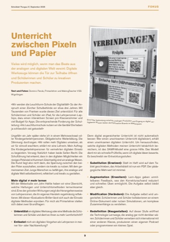 FOKUS9Schulblatt Thurgau 3 | September 2025%u00abWir werden die Leuchtturm-Schule der Digitalit%u00e4t!%u00bb So der Anspruch einer Z%u00fcrcher Schulbeh%u00f6rde vor etwa drei Jahren. Mit Tausenden von Franken wurde dieses Ziel unterst%u00fctzt: F%u00fcr alle Sch%u00fclerinnen und Sch%u00fcler ein iPad, f%u00fcr die Lehrpersonen Laptops, dazu einen interaktiven Screen pro Klassenzimmer und viel Budget f%u00fcr Apps. Die entsprechende Forderung der Schulleitung: %u00abAls Leuchtturmschule nutzen wir die Ger%u00e4te! Die haben ja schliesslich viel gekostet!%u00bbUngef%u00e4hr ein Jahr sp%u00e4ter stehe ich in einem Mehrzwecksaal voller Kindergartenlehrpersonen. Obligatorische Weiterbildung. Die Stimmung: durchzogen. %u00abWir sollen mehr Digitales umsetzen, als wir f%u00fcr sinnvoll erachten%u00bb, erkl%u00e4rt mir eine Lehrerin. Mein Auftrag: Die Kindergartenlehrpersonen f%u00fcr vermehrten digitalen Einsatz zu begeistern. Vorweg: Nat%u00fcrlich haben beide Seiten Recht. Die Schulf%u00fchrung hat erkannt, dass in den digitalen M%u00f6glichkeiten ein riesiges Potenzial schlummert. Gleichzeitig sind wir analoge Wesen. Die Kunst liegt also nicht darin, die Spannung zwischen den beiden Polen auszuhalten, sondern sie kreativ zu nutzen. Mit dem gemeinsamen Ziel: Junge Menschen zu bef%u00e4higen, ihre analoge und digitale Welt selbstbestimmt, reflektiert und kreativ zu gestalten.Mehr digital %u2260 mehr lernenMit der Metastudie von John Hattie haben wir eine %u00dcbersicht, welche Haltungen und Unterrichtsmethoden lernwirksamer sind. Eine der gr%u00f6ssten Wirkungen zeigt die Herangehensweise von Lehrpersonen, die ihr eigenes Handeln regelm%u00e4ssig reflektieren. Mit dieser %u00abEvaluations-Brille%u00bb l%u00e4sst sich auch der Einsatz digitaler Methoden erproben. F%u00fcr mich als Primarlehrer stellen sich dabei zwei Grundfragen:%u2022 Unterst%u00fctzt ein digitales Werkzeug oder eine Methode die Sch%u00fclerinnen und Sch%u00fcler und dient es ihnen zu mehr Lernfortschritt?%u2022 Entlastet mich ein digitales Vorgehen als Lehrperson in meiner Vor- oder Nachbereitung?Unterricht zwischen Pixeln und PapierVieles wird m%u00f6glich, wenn man das Beste aus der analogen und digitalen Welt vereint: Digitale Werkzeuge k%u00f6nnen die T%u00fcr zur Teilhabe %u00f6ffnen und Sch%u00fclerinnen und Sch%u00fcler zu kreativen Produzenten machen.Text und Fotos: Dominic Pando, Primarlehrer und MakingTeacher VSG Wigoltingen Denn digital angereicherter Unterricht ist nicht automatisch besser: Wer einen unwirksamen Unterricht digitalisiert, erh%u00e4lt einen unwirksamen digitalen Unterricht. Um herauszufinden, welche digitalen Methoden meinen Unterricht tats%u00e4chlich bereichern, ist das SAMR-Modell eine grosse Hilfe. Das Modell dient mir als schnelle Pr%u00fcfbrille, wenn ich digitale Ideen bewerte. Es beschreibt vier Entwicklungsstufen:%u2022 Substitution (Ersetzen): Statt im Heft wird auf dem Tablet geschrieben, das Arbeitsblatt ist nun ein PDF. Der p%u00e4dagogische Mehrwert ist minimal.%u2022 Augmentation (Erweitern): Lern-Apps geben unmittelbares Feedback, was den Korrekturaufwand reduziert und schnelles %u00dcben erm%u00f6glicht. Die Aufgabe selbst bleibt aber gleich.%u2022 Modification (Ver%u00e4ndern): Die Aufgabe selbst wird umgestaltet. Sch%u00fclerinnen und Sch%u00fcler kollaborieren an einem Online-Dokument oder nutzen Simulationen, um komplexe Zusammenh%u00e4nge zu verstehen.%u2022 Redefinition (Neugestalten): Auf dieser Stufe er%u00f6ffnet die Technologie Lernwege, die analog gar nicht denkbar w%u00e4ren. Sch%u00fclerinnen und Sch%u00fcler vernetzen sich international mit einer anderen Klasse, produzieren einen eigenen Podcast oder programmieren ein kleines Spiel.Eine tolle Verbindung zwischen analogen Produkten und Zugang zu digital verf%u00fcgbarem Wissen bieten die Exploration Boards im Makerspace.